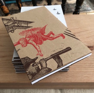 issue one is a 5″ x 8″ hand-bound cardboard book with upcycled grocery bags on the back cover. This issue features flash and micropoetry from 30 authors around the world (see below), and pen and ink/cut and paste illustrations. This little book explores the power of brevity while navigating the space between literary journals and zines.