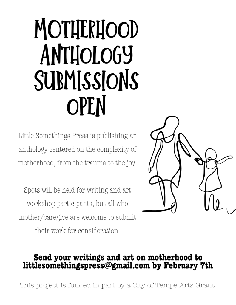 To submit, email littlesomethingspress@gmail.com your poetry, prose, and art centered on motherhood — the joy and the trauma — by February 7, 2026. Poetry should be under one page, and prose under 500 words. Art should be submitted as a JPEG or PNG file. If you attended one of the Motherhood Anthology Project workshops, please indicate this in your email.